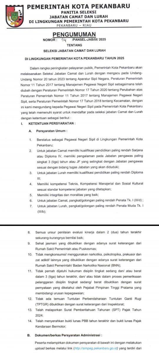 "Peserta yang bisa mendaftar adalah Aparatur Sipil Negara (ASN) di lingkungan Pemko Pekanbaru yang memenuhi persyaratan. Untuk jabatan Camat, pelamar minimal bergelar Sarjana (S1) atau Diploma IV dengan pengalaman sebagai pejabat pengawas minimal tiga tahun, serta berpangkat paling rendah Penata Tk. I (III/d). Sedangkan untuk jabatan Lurah, kualifikasi pendidikan minimal Diploma III dengan pangkat Penata Muda Tk. I (III/b)," papar Syamsuir, Sabtu (27/9/2025).