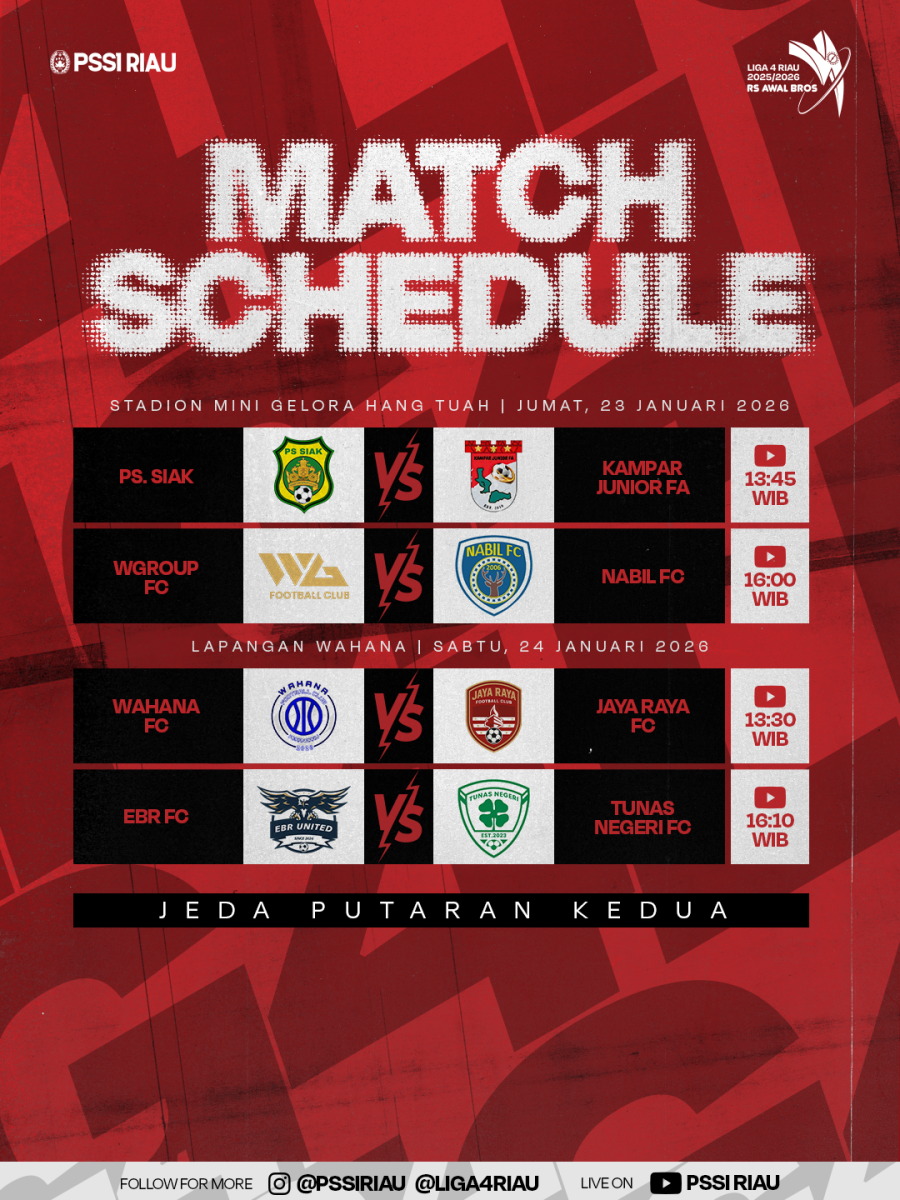 Sementara Wahana FC yang berstatus runner up sementara grup B bakal ditantang Jaya Raya FC yang berhasil menahan imbang EBR FC pada laga kedua.